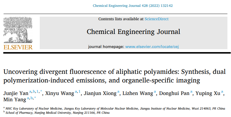 酰胺是構建脂肪族聚酰胺、肽和蛋白質的基本結構單元,并已證實是一種非典型性熒光團(luminogen)。然而,在當前設計的脂肪族聚酰胺研究體系中,具有相似結構和組成的脂肪族聚酰胺常常呈現出不同的熒光特征,但尚無相關研究其揭示內在的原因。因此,亟需構建組成和結構可控且熒光可調的脂肪族聚酰胺,以闡明酰胺結構及其非典型熒光(NTIL)性能之間的相關性,同時開發和拓展脂肪族聚酰胺在生物醫學領域中的新功能和新應用。近日,江蘇省原子醫學研究所楊敏研究員、嚴駿杰副研究員課題組在Chemical Engineering Journal上發表了題為“Uncovering Divergent Fluorescence of Aliphatic Polyamides: Synthesis, Dual Polymerization-Induced Emissions, and Organelle-Specific Imaging”的研究論文,通過硫代內酯化學構建了多個酰胺類別、分布和化學環境可調的脂肪族聚酰胺,多種分子間/分子內氫鍵相互作用賦予了其有別于聚集誘導發光(AIE)的聚合誘導發光 (PIE)現象。這些發現不僅解析了脂肪族聚酰胺中熒光多樣性的潛在原因,也為開發新型脂肪族熒光聚合物提供了新方法。