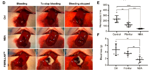 圖2. NBA 的止血能力 (D) NBA控制大鼠肝臟1厘米長和0.5厘米深矢狀面的切口傷口出血的代表性圖片。 (E)、(F) 大鼠肝臟劃痕模型中的止血時間 (E) 和失血量 (F)。