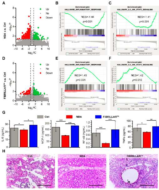 圖3. NBA有效地減少了傷口周圍的炎癥,促進了傷口愈合。(A) 與未治療組相比,NBA治療后傷口組織中差異表達基因的火山圖。 (B)、(C) 響應NBA治療的炎癥反應(B) IL6-JAK-STAT3信號通路(C)的基因集富集分析(GSEA)結果。 (D) FIBRILLARTM處理與PBS處理相比,傷口組織中差異表達基因的火山圖 (n = 3)。 (E) (F) 響應FIBRILLARTM 治療的炎癥反應(E)和IL6-JAK-STAT3信號通路(F)的GSEA結果。(G)ELISA量化傷口組織中的四種炎癥因子:IL-6、MCP-1、NF-κB 和 TNFα。(H) NBA治療后14天肝臟傷口的代表性 H&E圖。