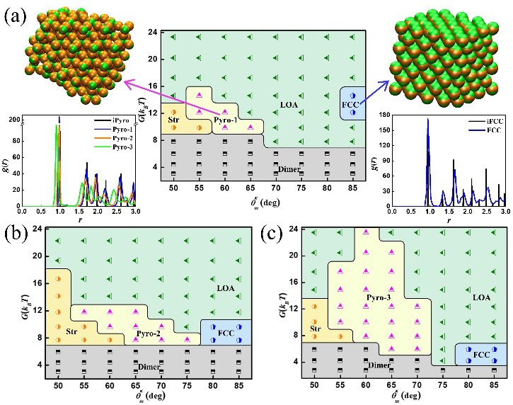 圖2:關于不同硬度兩面神膠體粒子的補丁大小和補丁間吸引強度的自組裝相圖。隨著粒子硬度逐漸減小(a-c, 粒子的彈性模量分別為42.0 MPa、11.2 MPa、2.2 MPa),pyrochlore結構相區(Pyro-1, Pyro-2, Pyro-3)會不斷增大。