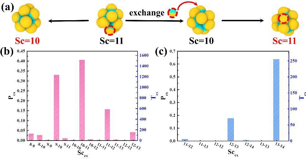 而且,他們發(fā)現(xiàn)在團(tuán)簇晶體χc相形成以后,團(tuán)簇之間仍然存在著大量的粒子交換,團(tuán)簇間的動態(tài)粒子交換是穩(wěn)定復(fù)雜團(tuán)簇晶體χc相的重要因素(圖5)。