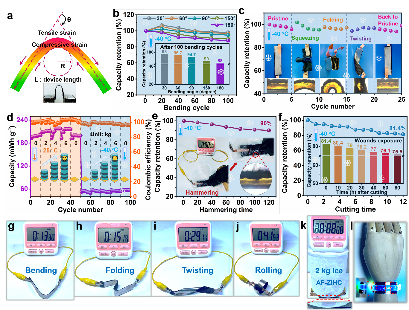 最后,基于PZHEs上述整合的優勢,作者組裝了柔性ZIHCs,研究了其在各種環境下的電化學性能。結果表明,ZIHCs在電化學和力學性能方面均展現出非凡的低溫適應性(圖6和圖7)。
