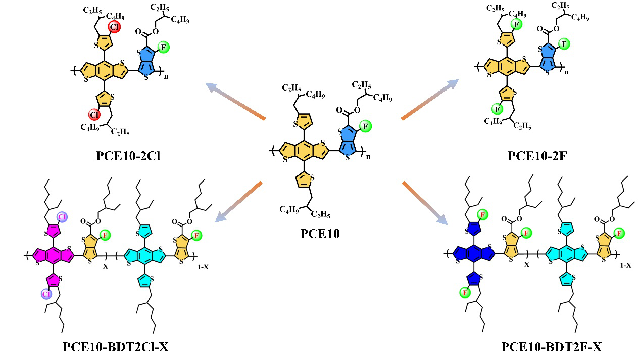 圖1. 聚合物給體PCE10、PCE10-2Cl、PCE10-2F、PCE10-BDT2F-X和PCE10-BDT2Cl-X化學結構。