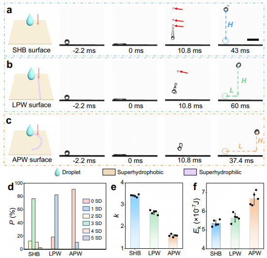作者在超疏水表面上構筑了具有非對稱粘附力的親水圖案,以直線型圖案(LPW表面)和半圓形圖案(APW表面)為代表,并對比研究了超疏水表面(SHB表面)與這兩種表面上的液滴的回彈行為差異(圖1a-c)。研究發現,液滴在SHB表面上有88%的概率會產生3個及以上的衛星液滴;在LPW表面上有82%的概率會產生1個衛星液滴;而在APW表面上則有90%的概率不產生衛星液滴。同時,他們發現液滴在脫離表面時的拉伸程度和液滴的衛星數目正相關,而與主液滴的動能呈負相關關系。這表明液滴的失穩程度(由拉伸程度和衛星液滴的數目來表征)可以通過非對稱圖案化的浸潤性基底來調控。