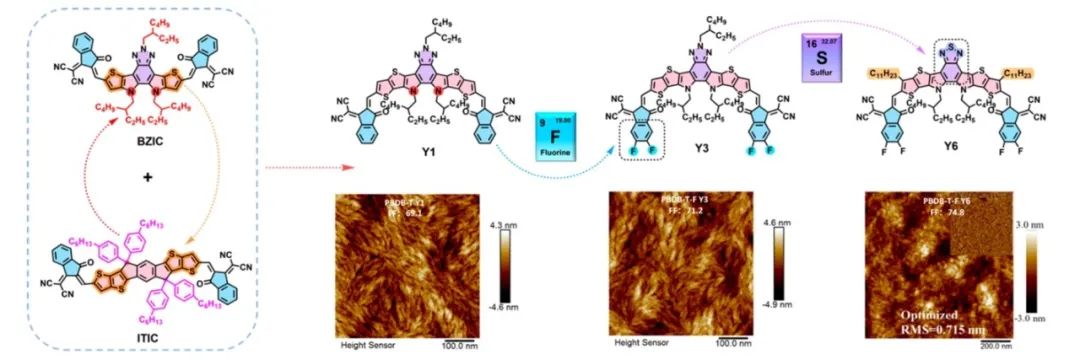 在有機太陽能電池 (OPV)的研究領域,新型非富勒烯受體的開發與利用一直是一項至關重要的研究課題。Y系列非富勒烯受體(Y是Yang的簡寫),由于其窄帶隙,近紅外吸收范圍的特點,已成為高性能有機太陽能電池的重要組成部分。2019年, Y1受體分子創造了12.6%的有機光伏世界紀錄,開創了Y系列受體分子的先河。作為Y系列受體分子的延續,Y3受體分子首次突破了14%的轉換效率, Y6受體分子首次突破了15%的世界記錄,將Y系列受體的研究熱潮推至巔峰。然而,過去三年自從Y6分子發表以后, Y系列分子后續設計并沒有明顯的突破;這段時間OPV的突破主要是由于器件方面的設計,比方說多組分的器件結構。Y系列受體的原創性設計原則一直沒有得到系統性的研究與討論。
