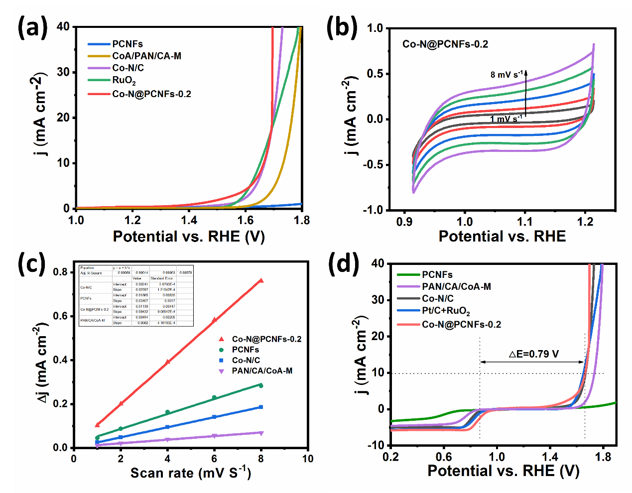 圖 6. (a) OER LSV 曲線。(b) Co-N@PCNFs-0.2在不同掃描速率下的 CV曲線。(c) 電流密度和掃描速率的線性圖(1.1 V vs. RHE)。(d) ORR/OER LSV 曲線。