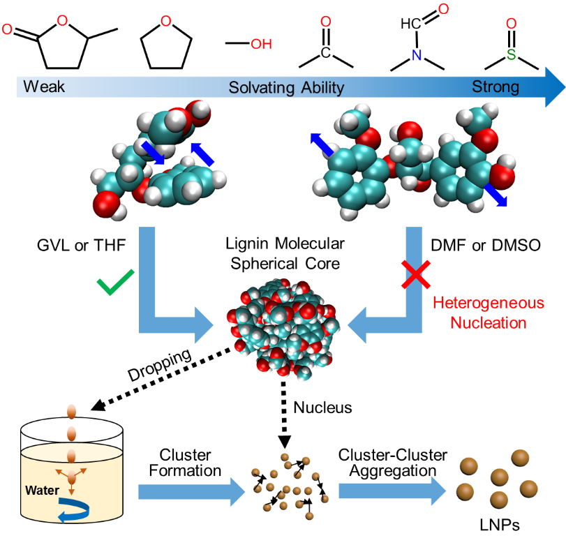 木質(zhì)素是地球上最豐富的可再生酚類生物聚合物,很可能取代石油基芳烴聚合物。木質(zhì)素的穩(wěn)定可以實(shí)現(xiàn)經(jīng)濟(jì)可持續(xù)發(fā)展。木質(zhì)素納米顆粒(LNPs)是一種自組裝的木質(zhì)素膠體,具有生物可降解性和生物相容性的優(yōu)點(diǎn),近年來(lái),LNPs主要被用作一種綠色工具,通過(guò)它們之間強(qiáng)烈的非鍵相互作用來(lái)攜帶藥物、基因和蛋白質(zhì),用于抗微生物或疾病的治療,成為生物醫(yī)學(xué)中一種理想的載體。目前大多數(shù)研究認(rèn)為,木質(zhì)素分子之間的π-π堆積和氫鍵作用導(dǎo)致了納米球的形成。例如,在溶劑交換法制備納米木質(zhì)素的過(guò)程中,由于良溶劑和不良溶劑之間的分子間相互作用,木質(zhì)素分子會(huì)聚集成納米球。然而,沒(méi)有人能夠解釋為什么溶解在某些溶劑中的木質(zhì)素不能通過(guò)溶劑交換法形成均勻的納米球。