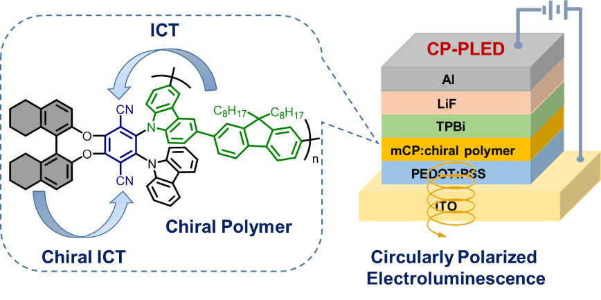 圓偏振發光(CPL)是一種手性發光材料具有的特殊性質;目前將各種手性熒光、磷光等材料作為發光層制備圓偏振發光二極管(CP-OLED)從而實現電致圓偏振發光(CPEL)的策略被廣泛報道,尤其是利用具有熱激活延遲熒光(TADF)性質的手性發光材料實現更加高效的CPEL引起了更多相關領域研究者的關注。然而過去幾年中這一領域的相關報道更多是針對具有TADF性質的手性有機小分子材料。目前,設計同時具有CPL和TADF性質的聚合物并用于制備圓偏振聚合物發光二極管(CP-PLED)仍然是一個巨大的挑戰。