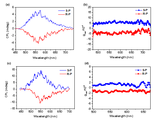 圖 2 R-P與S-P在(a)(b)甲苯稀溶液中;(c)(d)mCP摻雜膜中(退火處理后)的CPL曲線圖與不對稱因子散點圖