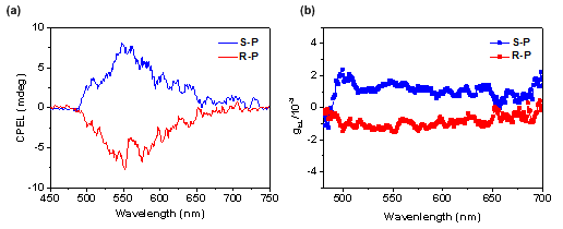 該課題組研究人員將兩個聚合物作為發光客體材料,制備了一組性質優異的CP-PLED器件,結構優化后的器件亮度最高可以達到12180 cd/m2,最大外量子效率(EQE)、電流效率(CE)、功率效率(PE)分別可以達到15.8%、54.0 cd/A和37.7 lm/W。另外,分別以R-P 和S-P為發光材料制備的兩組CP-PLED器件實現了清晰明顯而鏡像的CPEL信號,其電致不對稱因子可以分別達到-1.5 × 10-3 與 +1.6 × 10-3,這一數值也與其摻雜膜體現的CPL信號相匹配。
