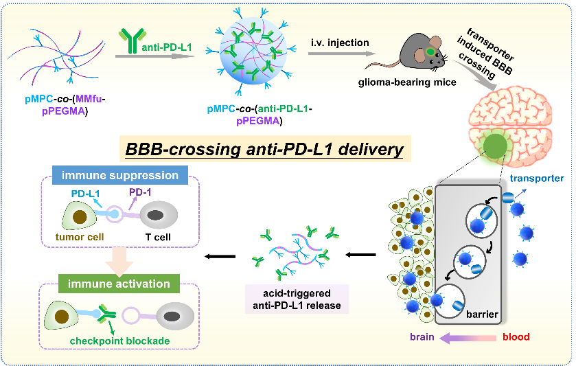 研究表明,血腦屏障的組成細(xì)胞可高表達(dá)多種受體及轉(zhuǎn)運(yùn)體,如轉(zhuǎn)鐵蛋白受體、膽堿類轉(zhuǎn)運(yùn)體等。因此,蘇州大學(xué)劉莊、蘇州大學(xué)附屬兒童醫(yī)院汪健等人合成了一種含有磷酸膽堿(MPC)的聚合物-抗體偶聯(lián)物,其中免疫檢查點(diǎn)阻斷抗體anti-PD-L1通過pH響應(yīng)的二甲基馬來酸酐偶聯(lián)至聚合物側(cè)基。由膽堿轉(zhuǎn)運(yùn)體與MPC的特異性結(jié)合而介導(dǎo)的轉(zhuǎn)運(yùn)作用可實(shí)現(xiàn)跨血腦屏障向腦膠質(zhì)瘤部位輸送anti-PD-L1。進(jìn)一步地,在腫瘤偏酸性的微環(huán)境下,二甲基馬來酸酐發(fā)生水解,所釋放出的anti-PD-L1結(jié)構(gòu)不發(fā)生改變,從而實(shí)現(xiàn)“無痕”修飾和快速釋放(圖1)。