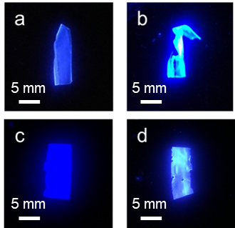 圖1. 不同含量的CNC/PVA共組裝膜材料在365 nm紫外輻照燈下拉伸前(a和c)及對(duì)應(yīng)拉伸發(fā)生應(yīng)變后(b和d)觀測(cè)的光致發(fā)光照片