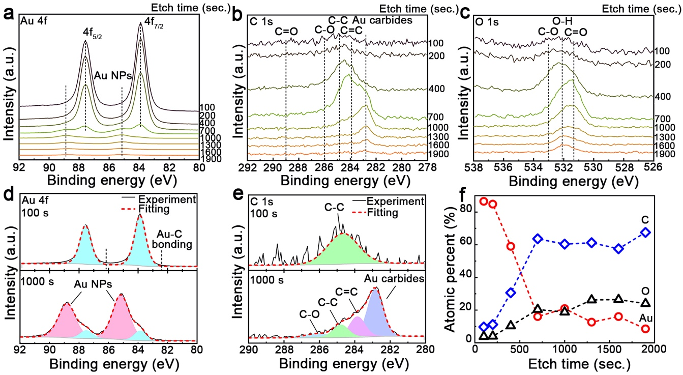 為了進一步研究金納米片的微觀結構,作者做了光電子能譜深度剖析(圖2)。Au 4f的窄XPS光譜(圖2a)結果顯示,當蝕刻時間小于700 s時,只有兩個明顯的純金特征峰。當蝕刻時間大于1000 s時,出現了兩個額外的高結合能峰值。同樣地,在C 1s和O 1s的窄XPS 光譜上 圖2b,c),刻蝕1000 s后,也檢測到額外的低能峰,前者與金碳化物的形成有關,而后者與C=O相關。進一步的譜圖分析顯示Au 4f的額外的高能峰分別位于~85.1 和~88.8 eV(圖2d),略高于報道的常規的金納米顆粒對應的特征峰(84.8和88.5 eV)。同樣,刻蝕1000 s后的C 1s光譜分解為~286.1、~284.8、~283.9和 ~282.9 eV四個特征峰(圖2e),其中前三個可歸于C-O、C-C 和C=C鍵的結合,而最后一個~282.9 eV處的特征峰可歸因于碳化金。基于上述發現,作者推斷ABF觀察到的輕間隙原子(圖 1n)是碳原子。圖2f 顯示了Au、C和O的相對濃度隨蝕刻時間(或厚度)的變化,說明金納米片是一種梯度混合納米結構。
