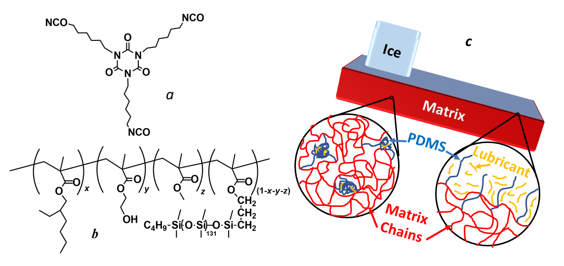 示意圖 (a) 交聯劑HDIT的結構式;(b) 用來制備涂層的接枝聚合物結構式;(c) 滑液灌注的NP-GLIDE 冰脫落涂層的示意圖。