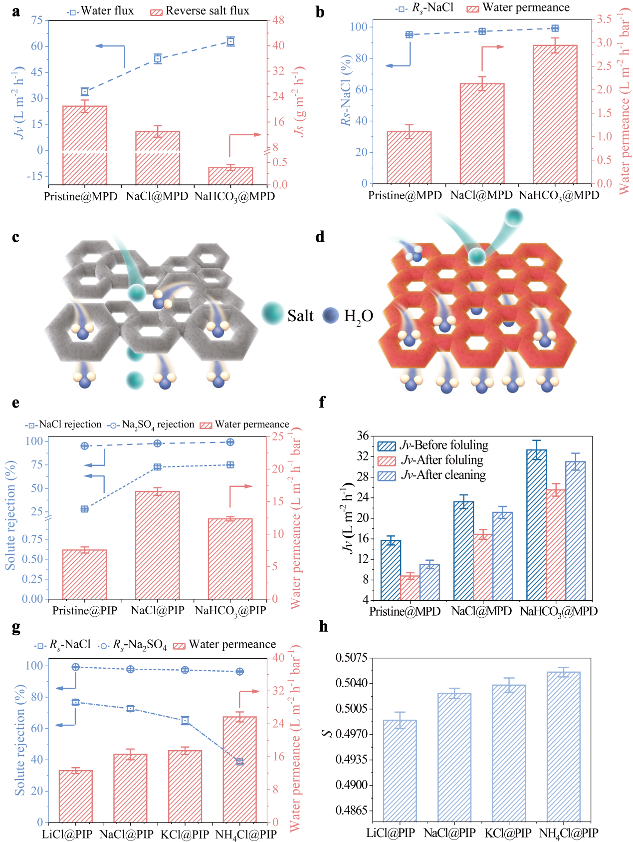 研究者通過將不同的無機鹽(如氯化鈉、氯化鉀、氯化銨、碳酸氫鈉、碳酸氫銨)分別加入到不同的胺單體溶液中(間苯二胺、哌嗪、聚乙烯亞胺)制備得到不同的聚酰胺復合膜,并應用到正滲透、反滲透、納濾過程。發(fā)現改性后的膜的水通量/水滲透性得到大幅度提升,同時反向鹽通量降低或鹽截留率提升,有效地克服了滲透性-選擇性的博弈關系(圖5a, b, e)。研究者還發(fā)現,加入無機鹽的種類會顯著地影響分離性能,為選擇合適的無機鹽來優(yōu)化分離性能做出了理論指導(圖5g-h)。同時,改性后的膜由于具有更親水、更光滑的膜表面,因而表現出更加優(yōu)異的抗污染性能(圖5f)。最后,研究者比較了無機鹽改性的聚酰胺復合膜同文獻報道的聚酰胺復合膜和商業(yè)聚酰胺復合膜的分離性能,證實了無機鹽改性的聚酰胺復合膜表現出更加優(yōu)異的分離性能(圖6)。