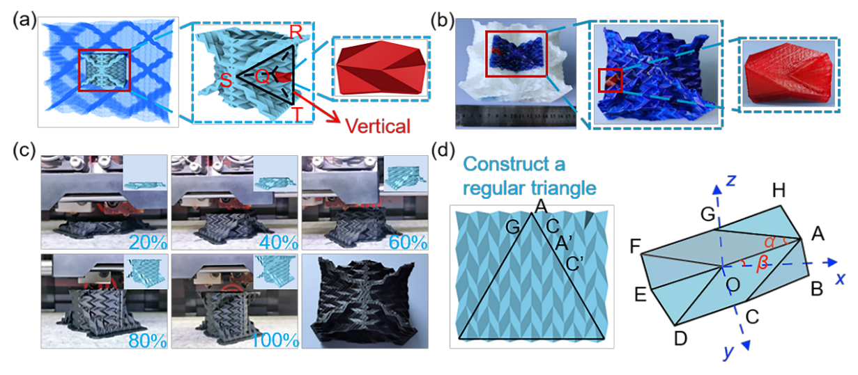 針對上述問題,西南大學(xué)化學(xué)化工學(xué)院、軟物質(zhì)材料化學(xué)與功能制造重慶市重點(diǎn)實(shí)驗(yàn)室黃進(jìn)教授和甘霖副教授團(tuán)隊(duì)提出了“無門檻”免支撐3D打印重復(fù)中空三維負(fù)泊松比結(jié)構(gòu)的策略。通過二維折紙單元的三維堆積匹配構(gòu)建重復(fù)四面體框架的構(gòu)想實(shí)現(xiàn)零向下凹點(diǎn)的負(fù)泊松比結(jié)構(gòu)設(shè)計(jì),建立了通用打印裝備和成型方式適用的 “無門檻”以及中空負(fù)泊松比結(jié)構(gòu)無需二次加工去支撐的“免支撐”打印技術(shù),突破了負(fù)泊松比結(jié)構(gòu)3D打印的材料類型、成型方式、過程裝備等多條件的約束,使強(qiáng)韌如ABS塑料、柔韌如硅橡膠等材料都能被賦予負(fù)泊松比特性。