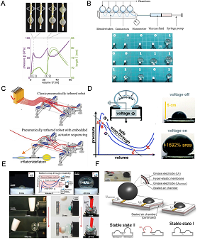 和前兩種驅(qū)動器相比,穹頂雙穩(wěn)態(tài)結(jié)構(gòu)可實現(xiàn)更大的三維屈曲變形,大面積的快速內(nèi)外翻折有利于其和流體的高效相互作用和復雜的氣流通道。利用不同的驅(qū)動模式,可實現(xiàn)仿生水母水下機器人,跳躍式軟體機器人和流控邏輯通路。
