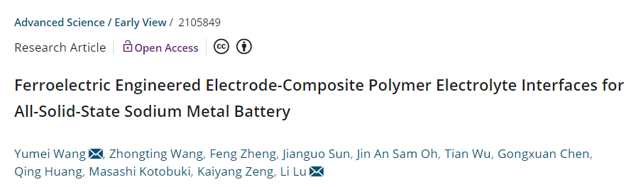 該工作以“Ferroelectric Engineered Electrode-Composite Polymer Electrolyte Interfaces for All-Solid-State Sodium Metal Battery”為題發表在《Advanced Science》上。
