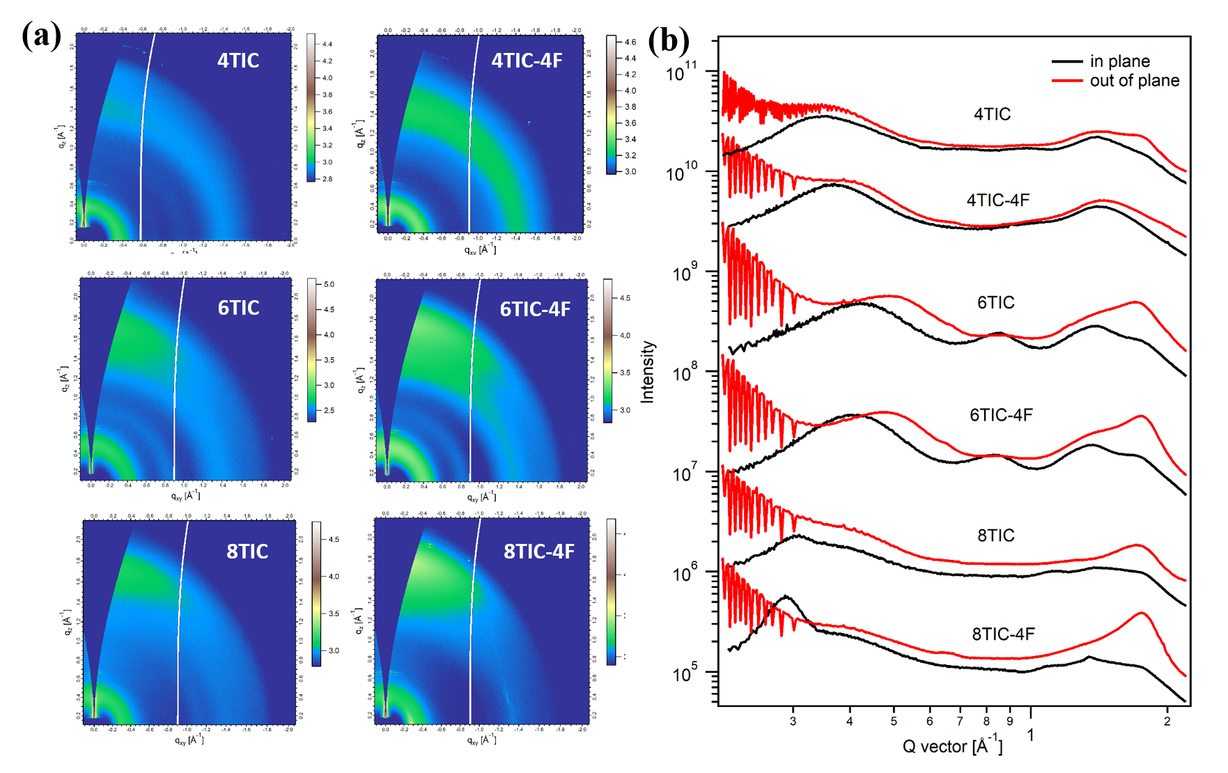 圖3. (a) 受體薄膜的二維GIWAXs圖, (b) 對(duì)應(yīng)面內(nèi)與面外曲線(xiàn)圖