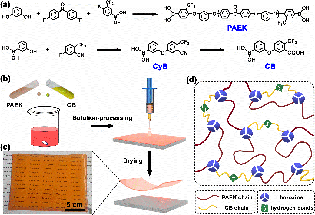 作者合成了兩種含有苯硼酸基團的單體:一個是苯硼酸封端的低分子量的聚芳醚酮(PAEK),另一個是同時含有苯硼酸和苯甲酸基團的分子CB。將二者在溶液中復合并在加熱下進行溶液鑄膜,即可得到內部含有硼氧六環和氫鍵兩種作用力的超分子塑料PAEK-CB (圖1),這種超分子塑料可實現大量制備。