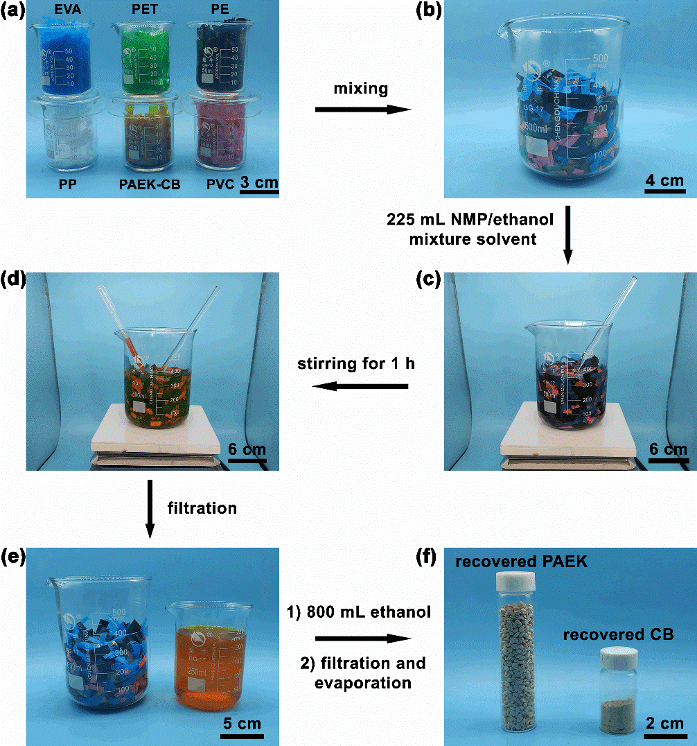 由于PAEK-CB的回收可在溫和的條件下實現,因此可以很方便地實現其在大量混合塑料中的選擇性分離。如圖5所示,將剪碎的PAEK-CB塑料與五種常見塑料的碎片混合(包括聚乙烯-co-乙酸乙烯酯(EVA)、聚對苯二甲酸乙二醇酯(PET)、聚乙烯(PE)、聚丙烯(PP)和聚氯乙烯(PVC)),再向混合塑料中加入NMP和乙醇的混合溶劑(體積比為10:1),可選擇性地將PAEK-CB溶解,而不破壞其他五種塑料。利用過濾的方法可收集含有PAEK和CB的溶液,向此溶液中加入乙醇,收集濾液和濾渣,即可回收得到PAEK和CB兩種單體,且回收得到的兩種單體依然具有高的純度,可用于PAEK-CB塑料的制備。