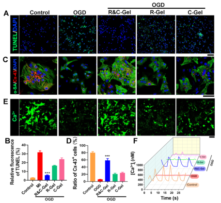 圖3:糖氧剝奪條件下復(fù)合水凝膠對(duì)NRCMs的影響及性能分析。A) NRCMs的TUNEL染色圖像和B)陽(yáng)性細(xì)胞的相對(duì)熒光定量。C)免疫熒光染色CX-43(紅色)和α-肌動(dòng)蛋白(α-SA,綠色)和D) CX-43陽(yáng)性細(xì)胞定量。E) NRCMs自發(fā)的鈣瞬變和F)相關(guān)頻率信號(hào)。
