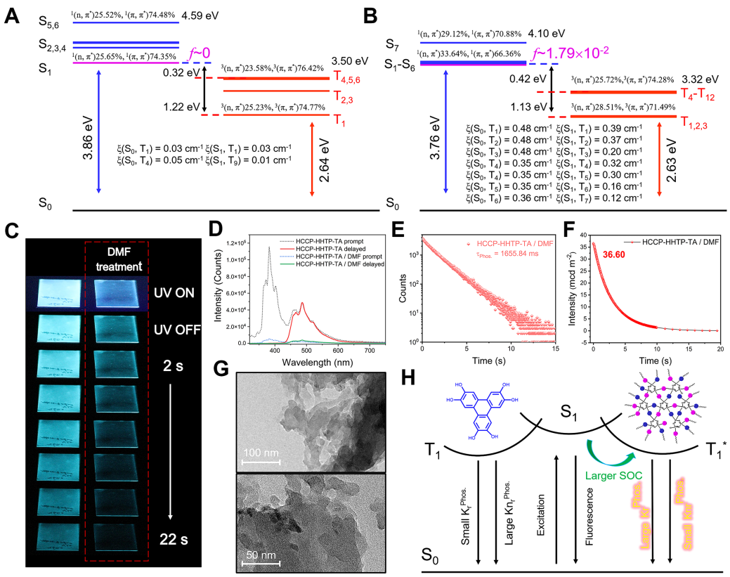 結(jié)合理論計(jì)算進(jìn)一步揭示了聚磷腈室溫磷光納米球的發(fā)光機(jī)制。首先,HHTP在S1能級(jí)上的振蕩強(qiáng)度f 接近0,而在交聯(lián)結(jié)構(gòu)HCCP-HHTP中大幅增強(qiáng)到1.79×10-2。同時(shí),在S1能級(jí)上,HHTP具有25.65% 1(n,π*)和74.35%1(π,π*)比例的電子構(gòu)型,而在HCCP-HHTP中則變?yōu)?/span>33.64%1(n,π*)和66.36%1(π,π*)。在S1能級(jí)上大幅度增強(qiáng)的f和電子軌道構(gòu)型的差異不僅證明了HCCP-HHTP-TA交聯(lián)納米球的熒光發(fā)射增強(qiáng)的原因,也滿足了ISC過程中激發(fā)態(tài)電子從S1到T1躍遷的條件。其次,不僅在S1態(tài),在T1態(tài)的軌道構(gòu)型差異也非常明顯。例如,HHTP在T1 的軌道電子構(gòu)型的比例為25.23% 3(n, π*)和74.77% 3(π, π*),而在HCCP-HHTP中,其軌道構(gòu)型比例變?yōu)?/span>28.51% 3(n, π*)和71.49% 3(π, π*)。根據(jù)El-Sayed 規(guī)則,3(n, π*)從25.23%增加到28.51%,證明在T1能級(jí)有更多的激子參與了磷光的弛豫。同時(shí),與HHTP中74.77% 3(π, π*)電子構(gòu)型相比,3(π, π*)在HCCP-HHTP中比例降低至71.49%。總的來說,S1和Tn在n和π軌道的比例上的較大差異會(huì)產(chǎn)生較大的SOC常數(shù),進(jìn)一步促進(jìn)三重態(tài)激子在T1能級(jí)上的RTP發(fā)射。最后,相比較于HHTP,其HCCP-HHTP的S1的垂直激發(fā)能從3.86 eV降低到3.76 eV,T1能級(jí)的能量從2.63 eV提高到2.64 eV,S1和T1之間的能隙(ΔEST)變窄,促進(jìn)了Sn與Tn的自旋交換。例如,HHTP的ΔEST值為1.22 eV,而HCCP-HHTP的ΔEST值則降低到1.13 eV,縮小的ΔEST將有利于ISC過程,在S1上激子通過自旋翻轉(zhuǎn)更容易產(chǎn)生更多的三重態(tài)激子。