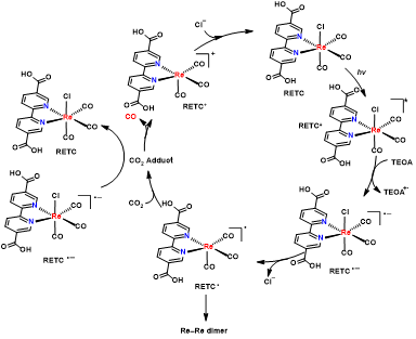 為了進(jìn)一步研究膠束催化劑的優(yōu)越性,他們還將分子RETC作為光催化劑用于CO2RR(圖6c)。雖然RETC可溶于水介質(zhì)和CH3CN,但沒(méi)有檢測(cè)到CO的產(chǎn)生。相比之下,以DMF為溶劑的光催化實(shí)驗(yàn)得到的TONCO只有3。根據(jù)前人對(duì)Re(bpy)(CO)3Cl催化CO2RR的研究,從[RETC]??中去除Cl-是光催化反應(yīng)的關(guān)鍵步驟(圖7)。五配位配合物[RETC]?可二聚形成不具活性的錸-錸二聚體。
