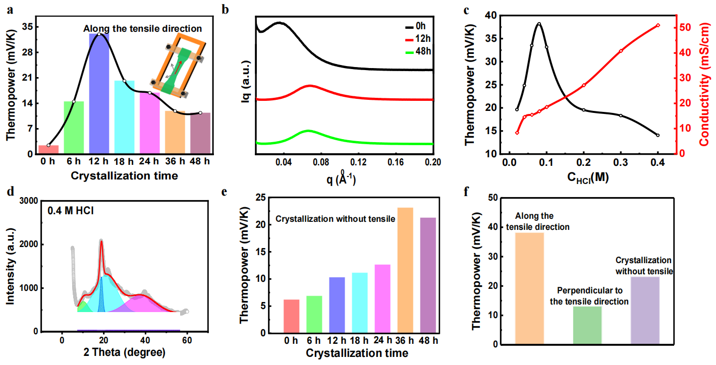 在典型的固相萃取中,如果自由體積足夠大以允許陽離子遷移,陽離子會從一個位置跳到另一個位置。在通過調控氫鍵強弱來實現不同結晶度的PVA水凝膠中,以常見的醇類晶體的氫鍵長度為依據,鏈狀PVA晶體的氫鍵長度約在266-275 pm之間。在所有的離子中,H+具有最小的離子Pauling直徑(遠小于266 pm),這足以使其在PVA晶體中獲得足夠大的自由體積來進行運動。而對于與之對應的陰離子,例如Cl-(離子直徑為362 pm),其必將被嚴重的限制在PVA結晶區之外。所以,他們初步猜測,聚合物的結晶度很可能引起離子的差異化運動,從而提高離子熱生電的能力。并且,在無機電解質中,相比于其他陽離子,H+具有水環境下的最大質量擴散系數 (9.311×10-5 cm2 s-1)。因此,H+型離子熱電材料可能是研究P型熱電器件的理想載體。此外,最近有理論推測使用帶有明顯雙電層的、具有高度取向性的帶電納米通道可以增強熱生成電壓的產生。作者通過簡單的室溫拉伸結晶形成的定向纖維結構也被證明可以提高離子水凝膠的熱電性能。