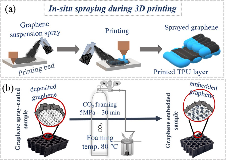 該工作開發了一種實用、可擴展、高導電性、低填充物含量的柔性3D打印壓阻傳感器。他們將熔融沉積建模(FDM)3D打印技術結合原位噴涂技術,制備了一種導電傳感器。在傳感器的3D打印過程中,將石墨烯懸浮液噴灑在每一層上,這有助于在打印傳感器的表面和界面上形成導電網絡。沉積在表面上的石墨烯通常會受到納米顆粒分層的影響,并隨著時間的推移失去其功能。為了避免這種情況,對制備的樣品進行發泡處理。發泡處理使傳感器內部形成微孔結構,并且表面沉積的石墨烯能夠嵌入TPU表面。