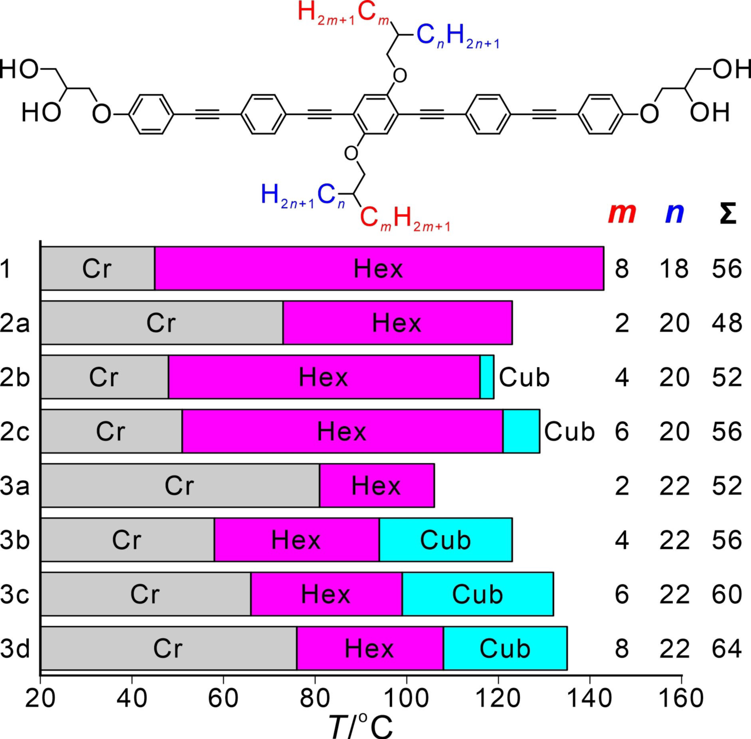 在本研究中,以棒狀基元為核心的不對(duì)稱(chēng)星形多親性分子,在液晶相中自組裝形成了基于DT結(jié)構(gòu)的A15立方相。分子結(jié)構(gòu)如圖2所示,核心為棒狀低聚亞苯基亞乙炔基(OPE),兩端為極性的丙三醇形取代基,側(cè)鏈為非對(duì)稱(chēng)支化脂肪鏈,參照樣品為具體對(duì)稱(chēng)側(cè)鏈的分子。當(dāng)測(cè)量體積在合適的區(qū)間內(nèi)時(shí),分子自組裝形成了具有四面體網(wǎng)絡(luò)結(jié)構(gòu)的液晶A15立方相。