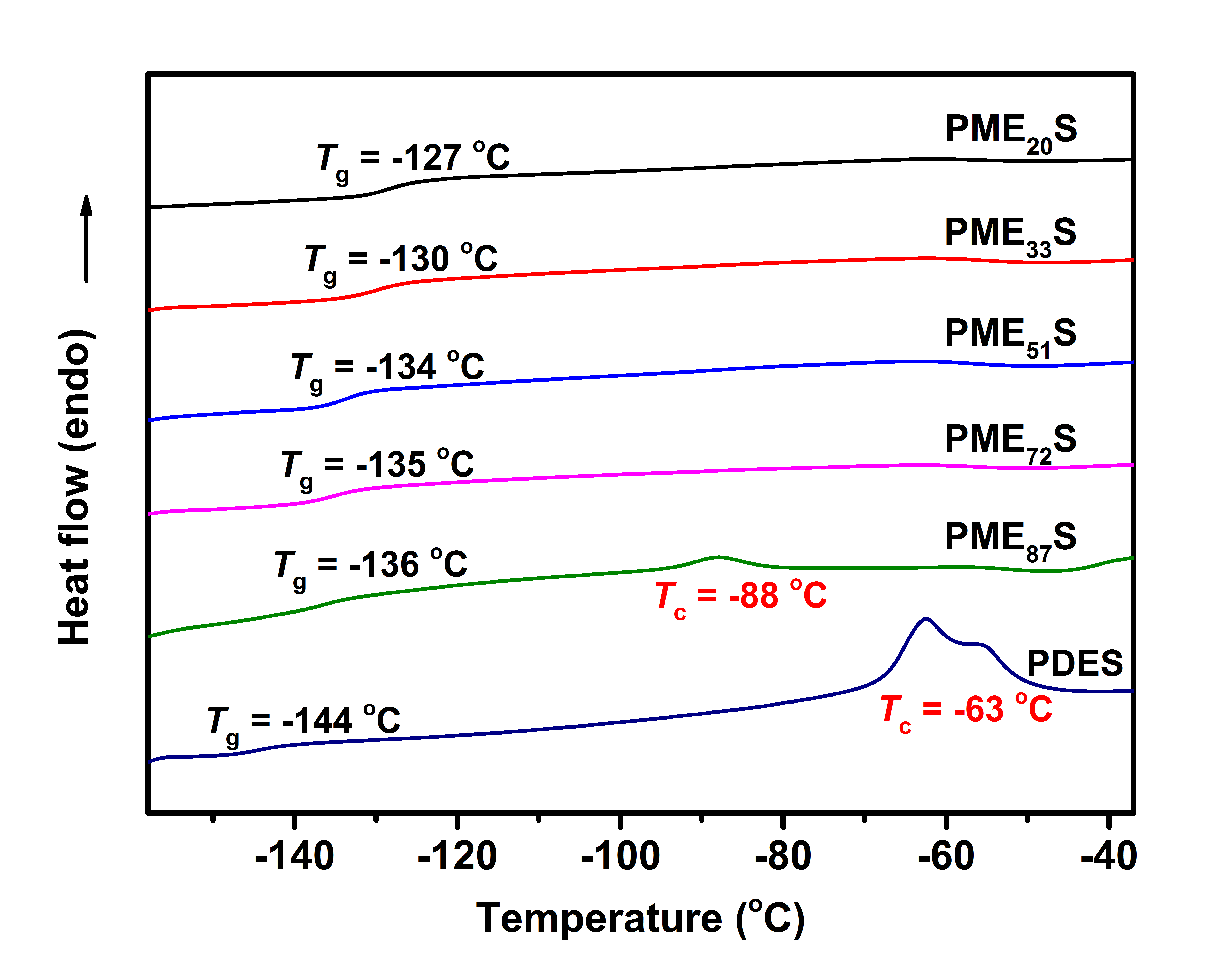 研究人員通過計算D3Et與D4的競聚率,研究了CTPB催化D3Et與D4的共聚行為。結(jié)果顯示:r (D3Et) = 1.05,r (D4) = 0.89(圖1),表明D3Et和D4的開環(huán)活性相近,保證了PMES共聚物無規(guī)的特性,進而證明CTPB具有高效的催化活性。通過差示掃描量熱法(DSC)(圖3)和熱重分析(TGA)研究了聚合物的熱性能,結(jié)果表明,PMES共聚物具有良好的低溫柔韌性和熱穩(wěn)定性,在極端環(huán)境應(yīng)用中顯示出巨大的潛力。