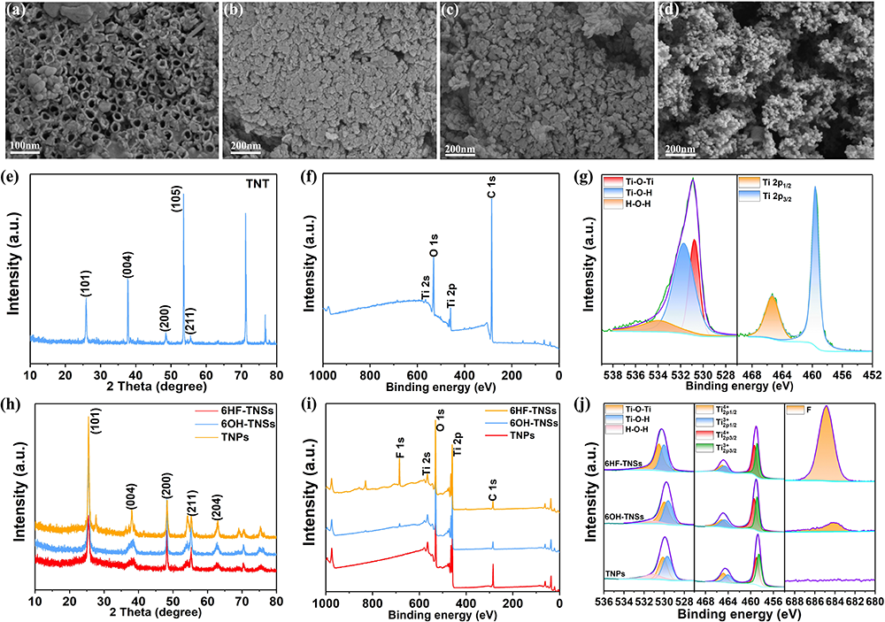3.a)和(bTNT6HF-TNSsSEM掃描電鏡圖像(c)和(d6OH-TNSsTNPSEM掃描電鏡圖像(eTNTXDR譜圖(fTNTsXPS光譜圖以及(gO 1sTi 2p的詳細譜圖(h6HF-TNSs6OH-TNSsTNPXDR譜圖(i6HF-TNS6OH-TNSsTNPXPS光譜圖以及(jO 1sTi 2pF 1s的詳細譜圖。
