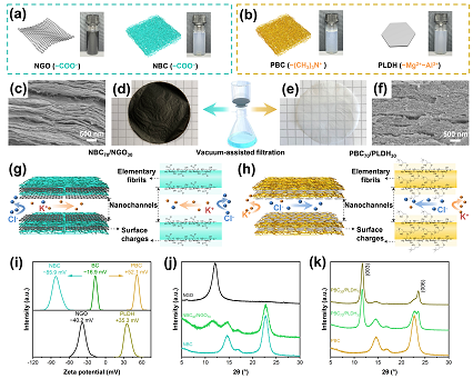 近日,哥廷根大學(xué)張凱教授團(tuán)隊(duì)與東華大學(xué)王華平/陳仕艷教授團(tuán)隊(duì)通過(guò)結(jié)合納米限域并耦合表面電荷和尺寸效應(yīng)設(shè)計(jì)了分別帶負(fù)電荷的細(xì)菌纖維素/氧化石墨烯(NBC/NGO)和帶正電荷的細(xì)菌纖維素/層狀雙氫氧化物(PBC/PLDH)離子選擇膜,并組合成為一對(duì)帶相反電荷的離子滲透發(fā)電機(jī)完成滲透能的持續(xù)輸出。一維納米纖維和二維納米片的耦合成為了構(gòu)建復(fù)合膜的有效新策略。該離子對(duì)在人造海水和河水條件下,實(shí)現(xiàn)了高達(dá)0.70 W?m?2的輸出功率密度。帶負(fù)電荷膜的最大輸出功率密度達(dá)到4.86 W?m?2。這項(xiàng)工作證明了層狀膜離子對(duì)作為高性能滲透發(fā)電機(jī)實(shí)際應(yīng)用的可行性,并首次證明層狀雙氫氧化物是研究和利用納米流體離子傳輸?shù)暮线m平臺(tái)。