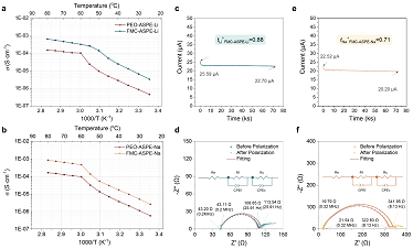4 FMC-ASPE-Li/NaPEO-ASPE-Li/Na聚合物電解質膜的離子傳導特性。變溫離子電導率測試結果表明FMC-ASPEs相比PEO-ASPEs的離子電導率顯著提高(ab)。陽離子遷移數測試(直流極化和交流阻抗)結果表明FMC-ASPEs具有較高的陽離子遷移數(FMC-ASPE-Li0.88FMC-ASPE-Na0.71)。