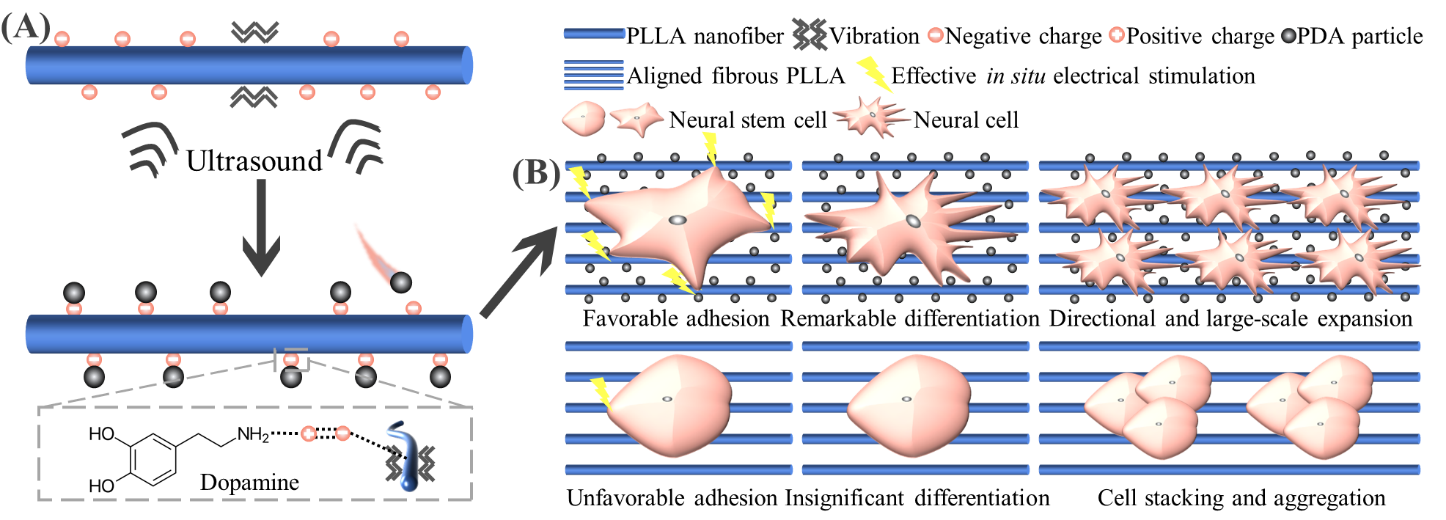 1 超聲激發PLLA納米纖維誘導聚多巴胺修飾原理及改性材料在神經干細胞分化和擴增中的應用。 A壓電電荷誘導多巴胺PLLA納米纖維上原位聚合 B聚多巴胺改性支架提供良好的細胞粘附條件來高效地傳輸電信號和支架的形貌信息,以促進神經干細胞的分化和取向排列