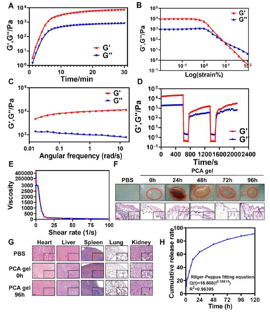 原兒茶酸(Protocatechuic acid , PCA)是一種來源于天然果蔬類的酚酸類物質,并且被證明可以靶向顆粒酶B的生理抑制劑SerpinB9 (Sb9),從而達到誘導腫瘤細胞凋亡的作用。雖然已有口服原兒茶酸能夠抑制四硝基喹啉-1-氧化物(4-nitro-quinoline-1-oxide, 4NQO)誘導的口腔鱗癌(OSCC)發生,但原兒茶酸的過短的半衰期仍然限制了其在臨床的進一步應用。為了克服原兒茶酸半衰期短的問題,四川大學陳謙明教授團隊結合其過往的研究基礎,構建了一種新型的原兒茶酸水凝膠。該水凝膠能夠通過緩釋延長原兒茶酸的半衰期,且具有良好的生物相容性和可注射性(圖1),體內實驗證明原兒茶酸能夠通過多種途徑促進OSCC凋亡,并在體內表現出較好的抗腫瘤效果(圖2)。