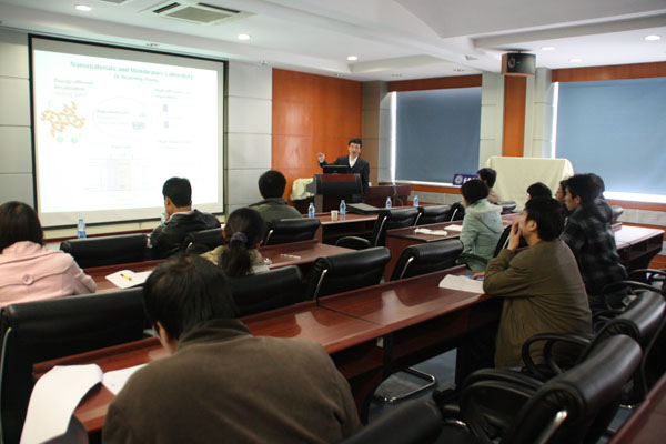 王煥庭教授做了題為“Zeolite Nanocrystals and Zeolite-polymer Nanocomposite Membranes”的學(xué)術(shù)報(bào)告,并與所內(nèi)科研人員進(jìn)行了熱烈討論。報(bào)告詳細(xì)介紹了分子篩納米結(jié)構(gòu)的合成、分子篩與高分子復(fù)合膜材料在海水淡化處理、氣體分離(N2/O2)以及質(zhì)子交換膜燃料電池和直接甲醇燃料電池等領(lǐng)域的研究進(jìn)展。
