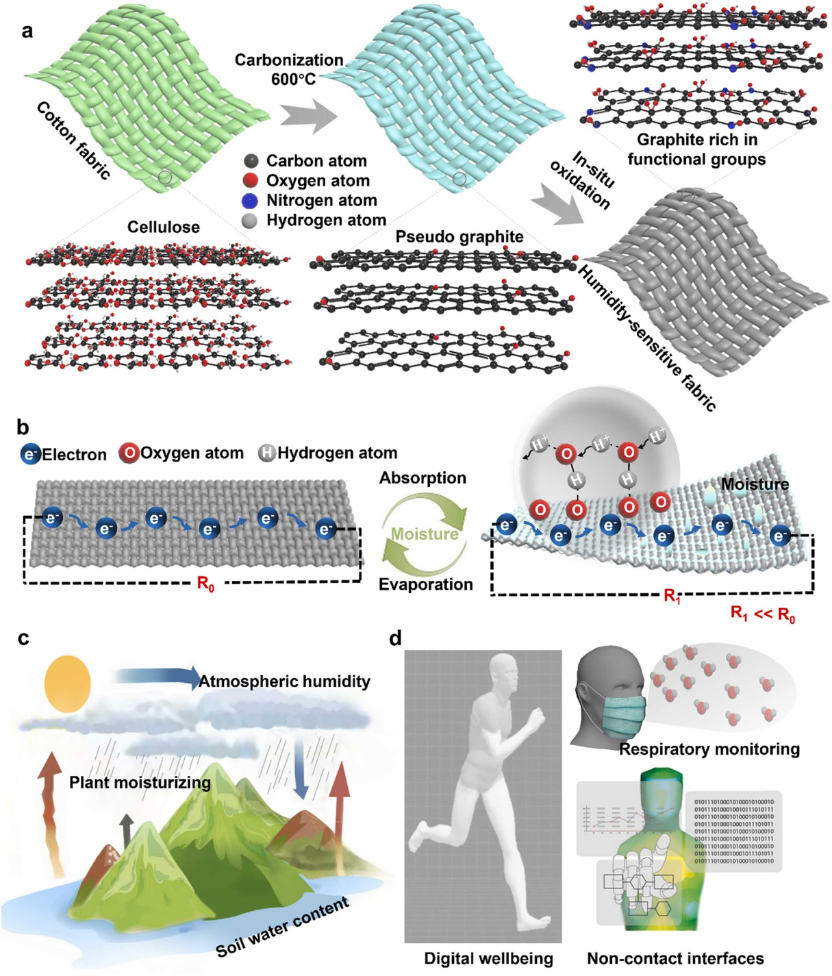 圖1介紹了氧化碳化織物(OCF)濕度傳感器的制備流程。首先,把棉布在600°C碳化,再在濃硫酸/濃硝酸的混合溶液里氧化形成帶有大量含氧官能團的石墨結構(圖1a)。在接觸到濕氣時,電子可以在含氧官能團間跳動,因此器件的電阻會大大降低(圖1b)。該器件可以廣泛運用于環境檢測(圖1c),智能健康,和非接觸式人機交互(圖1d)。