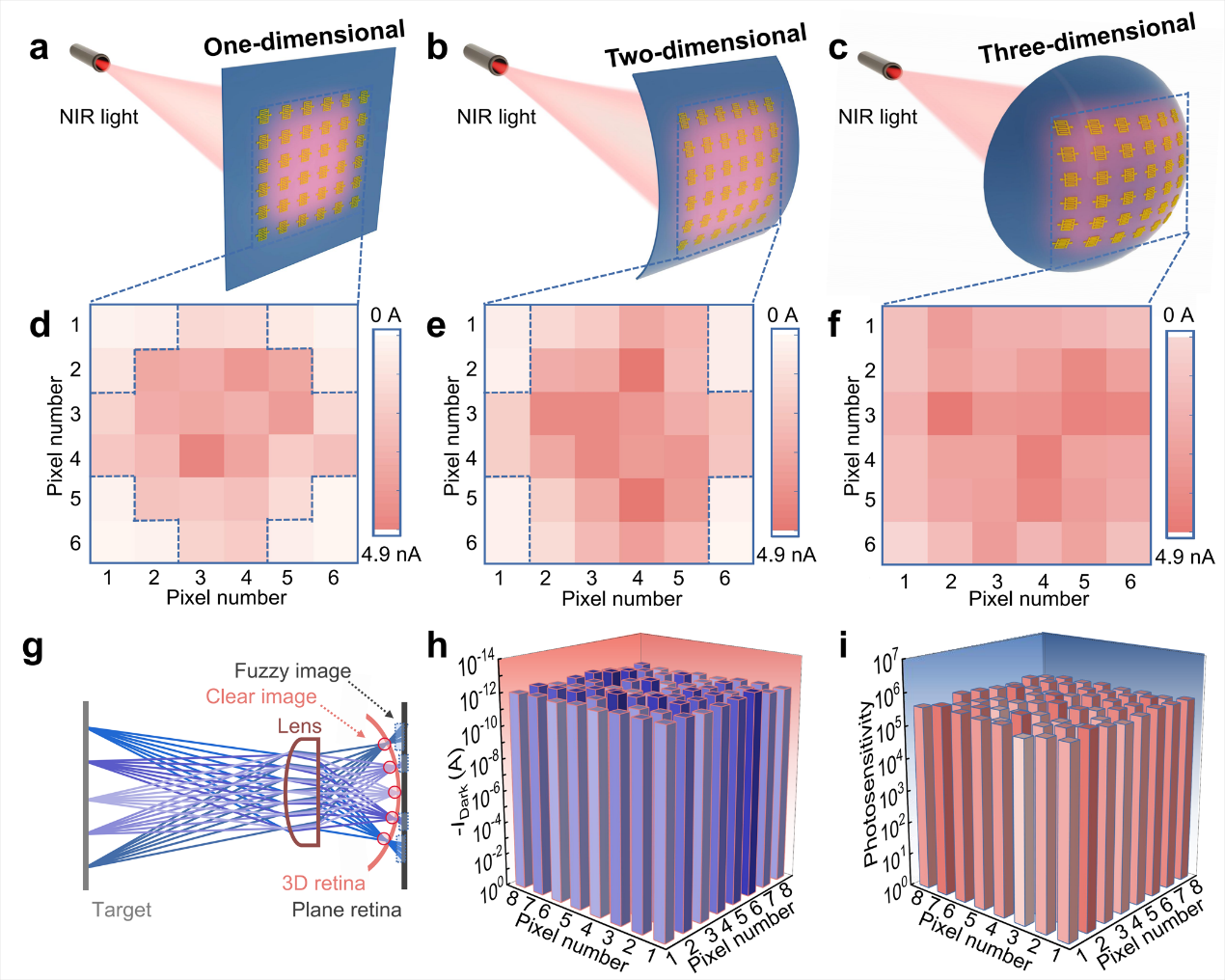 自然界中的各種生物眼視覺系統可以為近紅外成像設備提供多種設計靈感。視網膜的突出特點是具有半球幾何形狀和高靈敏度的圖像采集系統,這簡化了眼睛的光學復雜性,提高了視覺感知的成像質量。然而,由于半球形結構、組成材料和傳統成像模塊的局限性,開發具有這些特點的高性能近紅外仿生成像系統具有極大的挑戰。