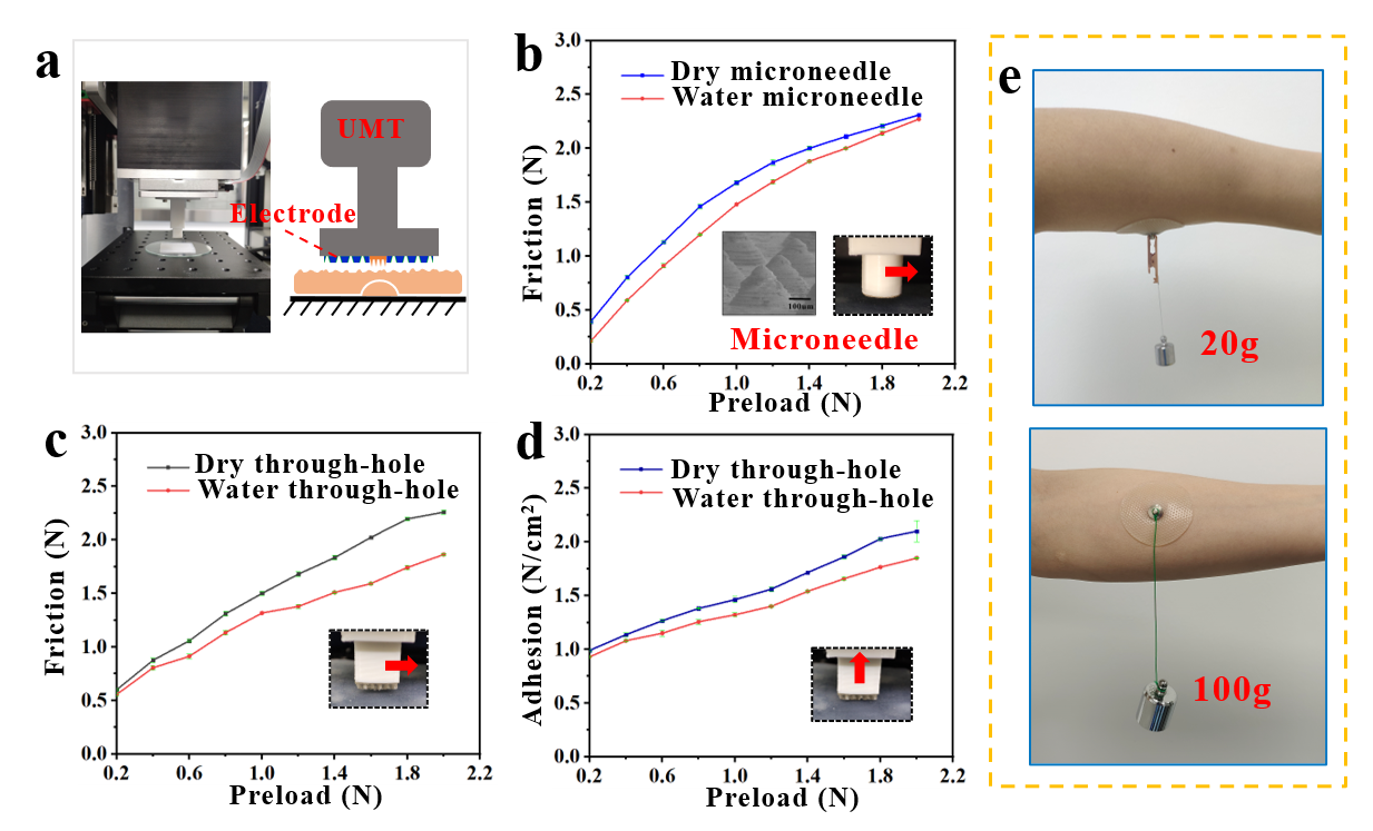 本研究介紹了一種兼具排汗透氣性和多機制附著性能的健康監測電極貼片。貼片的排汗透氣功能采用錐形通孔與蜂窩狀微溝槽集成設計來實現,錐形通孔產生的拉普拉斯液相壓差和微溝槽的毛細力協同實現了汗液的自驅導流作用;Ag/Ni微針陣列和PDMS-t粘附材料的多機制附著一定程度上保障了電極貼片與皮膚接觸的力學穩定性,其中,Ag/Ni微針陣列通過高度控制,形成與皮膚角質層的接觸,在保障安全性的前提下,實現了生物電信號采集通道的可靠性。