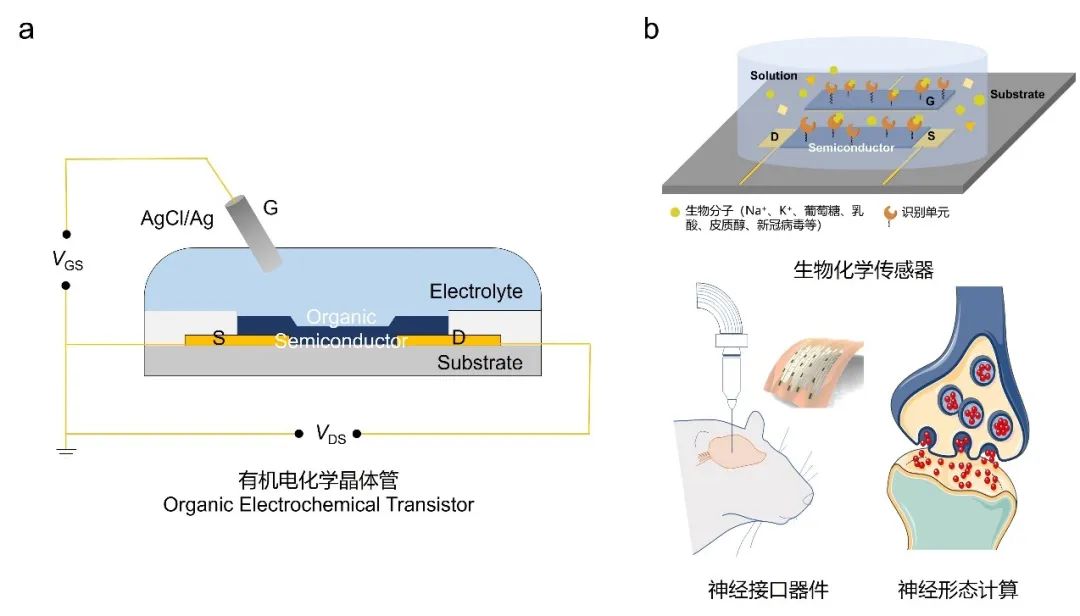 圖1 a 有機電化學晶體管器件結構示意圖;b 三種有機電化學晶體管應用:生物化學傳感器、神經接口器件、神經形態計算。