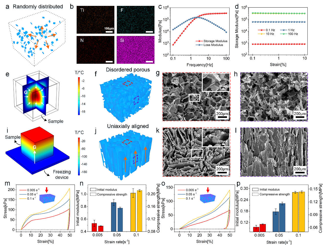 鑒于此,中國科學技術大學龔興龍教授團隊報告了一種仿珍珠層聚硼硅氧烷基復合材料。通過雙向冷凍與氮氣退火工藝制備殼聚糖(CS, Chitosan)/MXene層狀骨架,然后利用超聲輔助浸漬與室溫干燥引入具有剪切硬化特性的聚硼硅氧烷(SSG, shear stiffening gel),得到具有優異沖擊防護和電磁屏蔽性能的結構材料。通過應變率增強、結構致密化、片層位錯和裂紋生長的多尺度協同耗能機理,仿珍珠層聚硼硅氧烷基復合材料可有效衰減85.9% ~ 92.8%的沖擊力。得益于微米尺度的交替多層結構促進了電磁波的反射損失,該復合材料在極低的導電填料負載下(1.1 ~ 1.3 wt%),達到了47.2 ~ 71.8 dB的卓越電磁屏蔽(EMI,electromagnetic interference)效能。此外,該復合材料有望應用于沖擊監測和無線報警系統,并表現出可通過多種仿生策略的組合實現性能優化的潛力。本工作為構建輕質、高性能和多功能的仿珍珠層防護復合材料提供了可靠的策略。相關研究以“Nacre-Mimetic Hierarchical Architecture in Polyborosiloxane Composites for Synergistically Enhanced Impact Resistance and Ultra-Efficient Electromagnetic Interference Shielding”為題發表于最新一期《ACS Nano》上,論文第一作者為中國科學技術大學工程科學學院博士生劉帥,通訊作者為龔興龍教授和王勝副研究員。