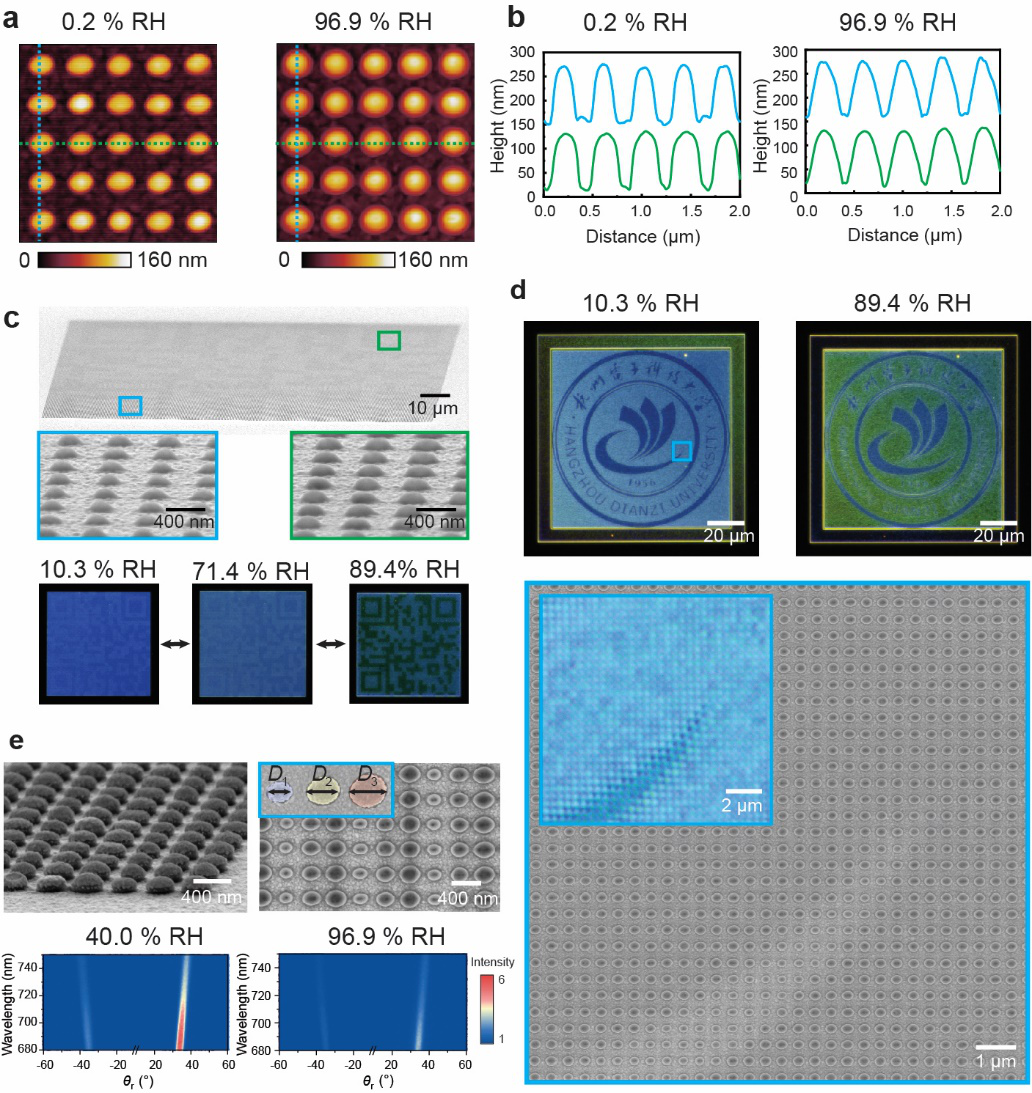 圖2. 利用氛圍原子力顯微鏡,觀測干燥(0.2% RH)和飽和(~97% RH)濕度下水凝膠納米點陣列的a) 形貌變化以及相應的b) 橫截面輪廓變化,證實其膨脹形變行為。c) 利用兩種直徑的點陣復合,形成濕度加密的二維碼圖像。d) 暗場顯微鏡下觀測高分辨率水凝膠結構色的變色行為。e) 利用三種直徑水凝膠納米點構成具備相位梯度的陣列排布,利用其膨脹實現光束偏折調制。