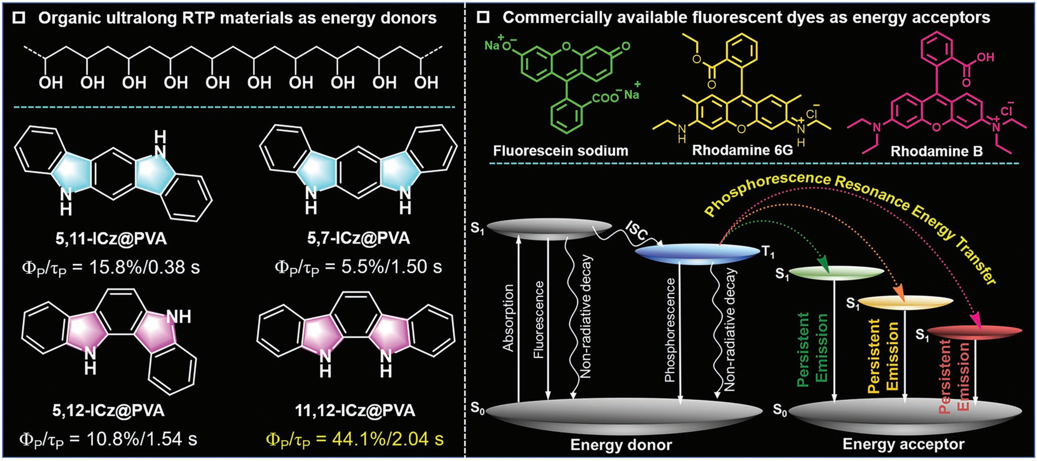 為了進(jìn)一步實(shí)現(xiàn)具有多維度可調(diào)諧固態(tài)發(fā)光特性的有機(jī)長余輝發(fā)光,作者利用具有超長藍(lán)色室溫磷光發(fā)射的吲哚咔唑異構(gòu)體作為能量給體,通過磷光共振能量轉(zhuǎn)移(PRET)賦予不同的有機(jī)熒光染料持久發(fā)光特性。根據(jù)F?rster共振能量轉(zhuǎn)移基本理論,高效的PRET需要滿足以下三個(gè)條件:能量給體的發(fā)射光譜和能量受體的吸收光譜之間的重疊面積比較大、能量給體和受體之間具有比較近的距離,以及合適的偶極-偶極取向。基于此,作者選擇了三種商業(yè)化的水溶性熒光染料分子,即熒光素鈉(Fluo)、羅丹明6G(Rh6G)和羅丹明B(RhB)作為能量受體。實(shí)驗(yàn)結(jié)果表明,通過簡單地調(diào)節(jié)Fluo/Rh6G/RhB共摻雜PVA體系的組成和摻雜濃度,即可實(shí)現(xiàn)發(fā)光顏色可調(diào)和時(shí)間依賴的有機(jī)長余輝發(fā)光(圖4M)。此外,通過詳細(xì)對(duì)比和分析不同共摻雜體系的發(fā)光特性,進(jìn)一步揭示了能量給體的結(jié)構(gòu)與PRET效率、長余輝發(fā)光效率以及壽命之間的變化規(guī)律。