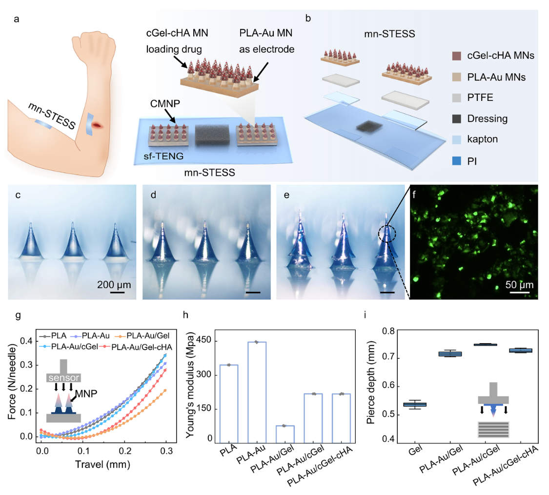 針對以上問題,中科院北京納米能源與系統研究所李舟、羅聃團隊與第三軍醫大學西南醫院張家平主任開發了一種基于微針的自供電經皮電刺激系統(mn-STESS)。通過將滑動式摩擦納米發電機與兩段式微針釋藥貼片結合,在多個層面實現了對EGF藥效學的改善。mn-STESS可利用微針刺穿角質層,并將EGF遞送至真皮層中;更重要的是,mn-STESS中整合的摩擦納米發電機將手指滑動的機械能轉化為電能,并通過微針施加經皮電刺激。mn-STESS施加的電刺激可以作為EGF的“輔助劑”:不僅抑制了GSH對EGF的還原;同時上調了表皮細胞中EGF受體(EGFR)的表達,成功改善了受體脫敏問題。該工作證明了基于自供電裝置的“電輔助劑”在改善藥物藥效方面具有巨大的應用前景,為傳統藥物創造了全新的聯合治療策略。相關研究成果以“Improved pharmacodynamics of epidermal growth factor via microneedles-based self-powered transcutaneous electrical stimulation”為題在線發表于《自然-通訊》(Nature Communications)。