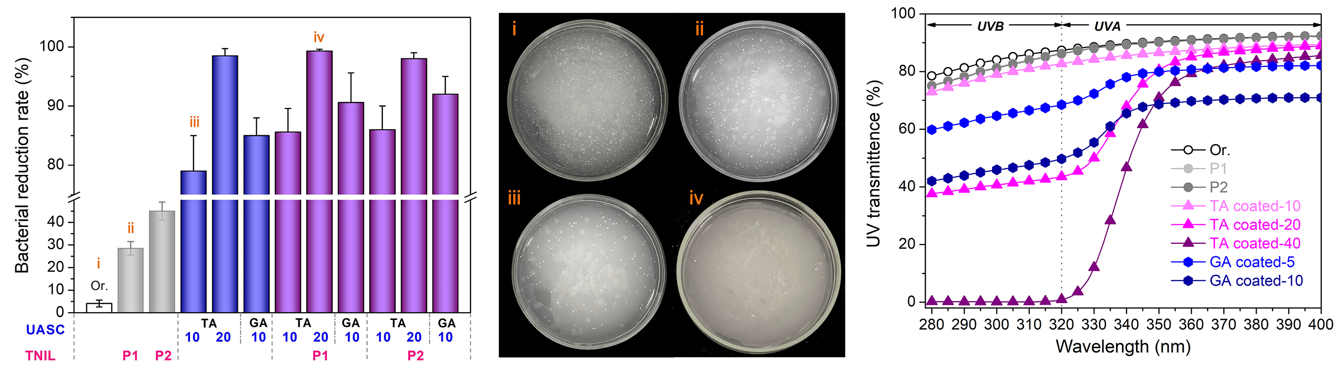 蘇州大學周宇陽博士與愛爾蘭都柏林大學助理教授張楠博士、王文新教授在《ACS Applied Materials & Interfaces》期刊上發表了題為“Toward the Scalable Fabrication of Fully Bio-Based Antimicrobial and UVB-Blocking Transparent Polylactic Acid Films That Incorporate Natural Coatings and Nanopatterns”的文章(DOI: 10.1021/acsami.2c15416)。本課題采用熱納米壓印(Thermal Nanoimprinting Lithography)和超聲霧化噴涂(Ultrasonic Atomization Spray Coating)兩種適用于薄膜的批量化加工技術,分別結合具有微納米錐形孔的陽極氧化鋁模板(Conical Porous Anodic Aluminum Oxide Template)和自制的天然多酚墨水,在聚乳酸薄膜表面批量化構造出全生物基抗菌、低UVB透過的微納米結構(如圖1)。微納米結構與天然多酚涂層的共同作用,賦予了聚乳酸薄膜高效安全的殺菌功能和防紫外線功能,具有在食品包裝、醫用防護等多領域的應用前景。