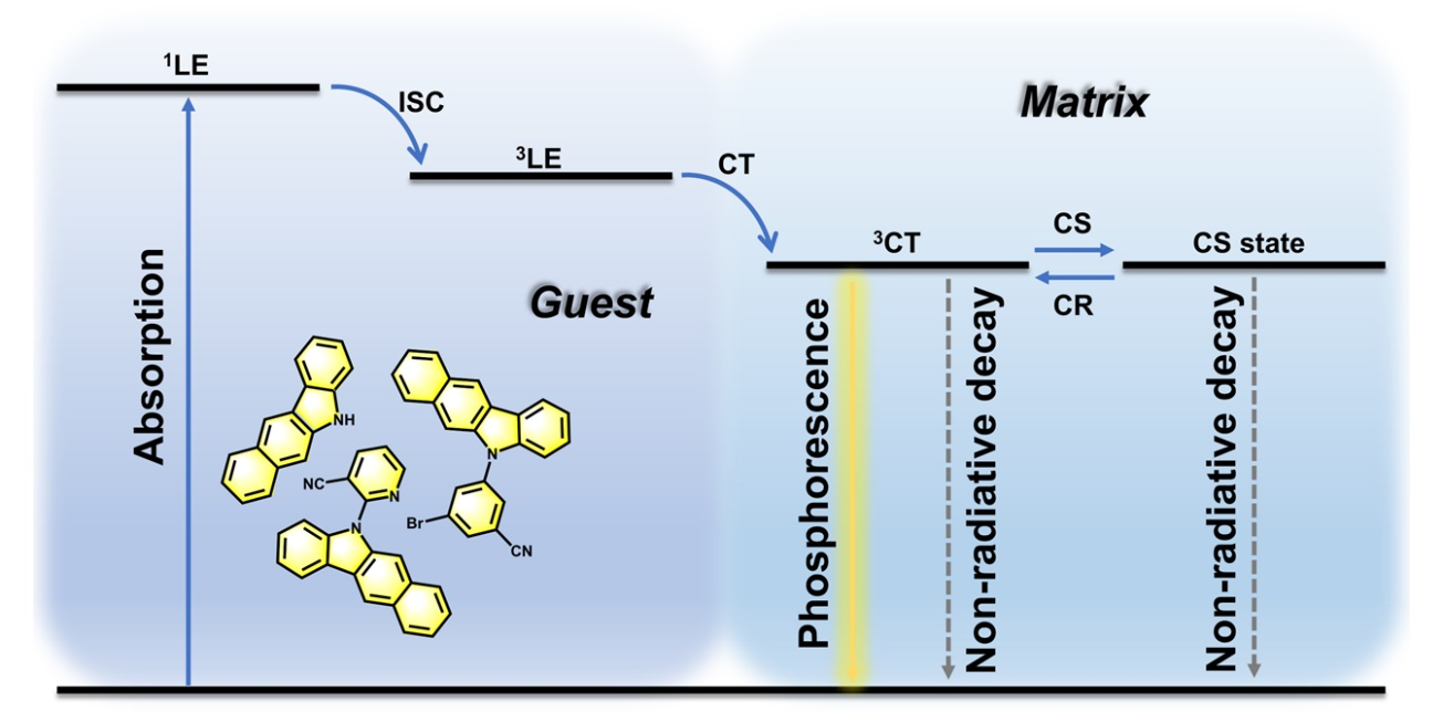 總而言之,該論文成功地發現了一種易于獲得的有機單元BCz,具有出色的RTUOP性能。CNPyBCz和CNBrBCz作為BCz衍生物的代表進行合成和研究。在低溫下,BCz及其衍生物在單體狀態下在550、600和650 nm處表現出黃色超長磷光,而其超長磷光帶在其自聚集狀態下紅移至600、660和730 nm,這是以前從未觀察到的。自聚集狀態下的紅移超長磷光可能是由具有擴展共軛結構的BCz單元之間的增強π-π相互作用引起的。令人興奮的是,BCz及其衍生物的PMMA薄膜由于其陽離子自由基的光誘導產生而在室溫下表現出光激活的黃色超長磷光。此外,利用BCz衍生物及其Cz對應物建立了出色的RTUOP客體-基質體系。當CNPyBCz(CNBrBCz)摻雜到CNPyCz(CNBrCz)中時,由于陽離子自由基可以通過Cz基質很好地穩定,摻雜粉末表現出強烈的黃色室溫超長磷光。此外,DMAP、BBP和DBT等其他基質也可以在室溫下激活BCz(衍生物)的黃色超長磷光。因此,BCz的功能與Bd類似,是在RTUOP領域對Bd的絕佳替代物。本研究隨機選擇CNPyBCz和CNBrBCz,設計了利用BCz構建的各種D-A結構來優化超長磷光的性質,這可能為有機磷光開辟新的研究方向。
