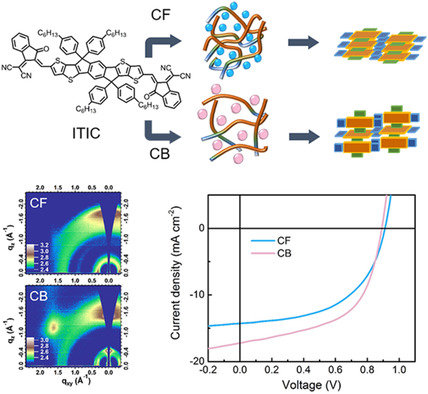近年來隨著非富勒烯受體材料的快速發展,有機太陽電池效率已經突破19%。研究發現,非富勒烯小分子受體的有序堆積形式對于光電轉化效率及電荷傳輸有著重要的影響,因此,對于非富勒烯體系共混形貌的形成與調控機制也成為進一步突破光伏效率的重點研究的方向之一。其中,目前受溶劑及加工條件影響的非富勒烯小分子受體的分子堆積形態的機理研究仍然相對缺乏。