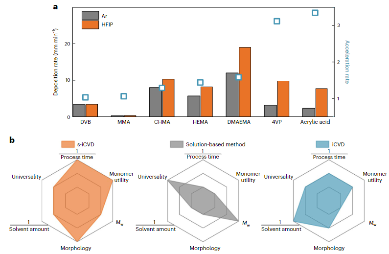 北京時間2023年2月9日,康奈爾大學的楊蓉教授團隊與楊晶杰教授合作在Nature Synthesis上發表了一篇題為“Engineering solvation in initiated chemical vapour deposition for control over polymerization kinetics and material properties”的研究成果。